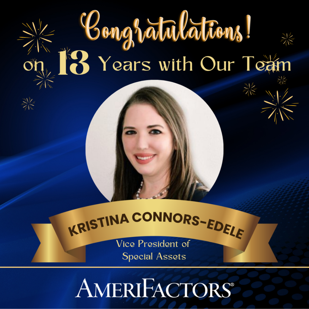 Congratulations to Kristina Connors-Edele on 13 incredible years with AmeriFactors! Kristina’s dedication, leadership, and expertise as Vice President of Special Assets have made a lasting impact on our team and the clients we serve. Thank you and congratulations Kristina!