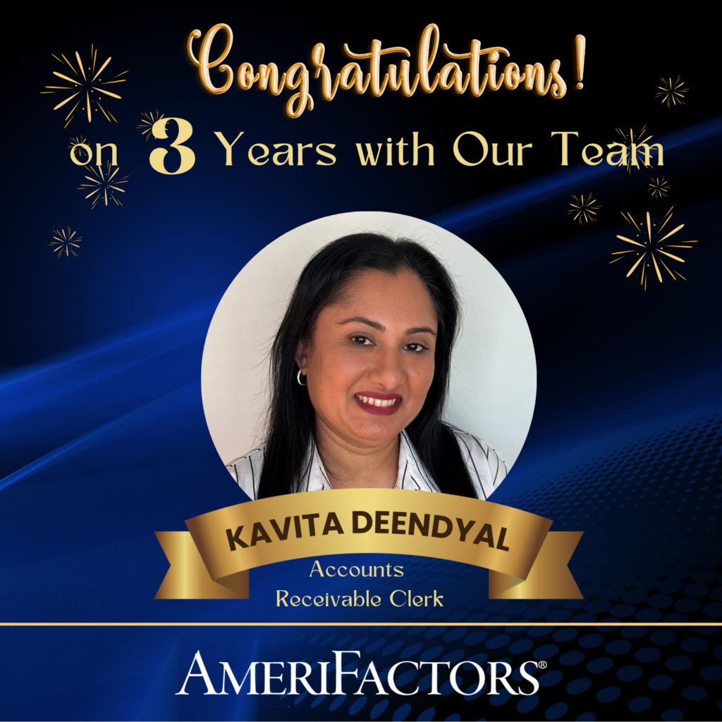 Please join us in celebrating Kavita Deendyal on 3 wonderful yearswith the AmeriFactors team! As an Accounts Receivable Clerk, Kavita’s dedication, attention to detail, and commitment to excellence have made a meaningful impact on both our clients and our company. Her strong understanding of our processes helps ensure smooth AR management and supports the reliable funding our clients depend on for continued growth and success. Thank you and congratulations Kavita!